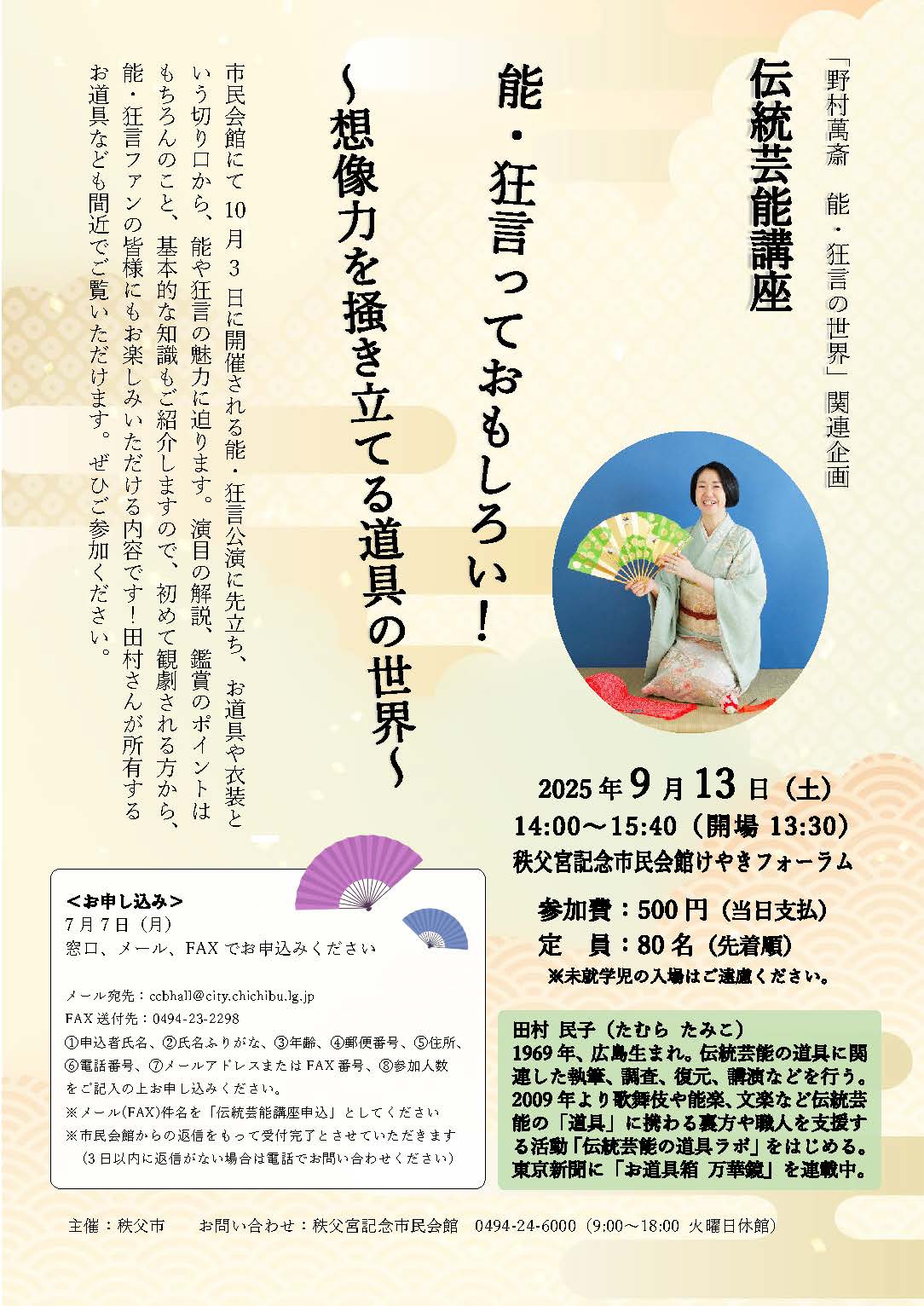 市民会館にて10月3日に開催される「能・狂言」公演に先立ち、お道具や衣装という切り口から、